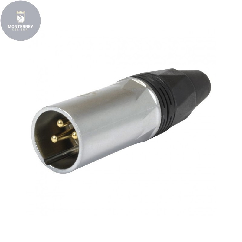Conector de cable macho de 3 polos con carcasa de níquel y contactos plateados.